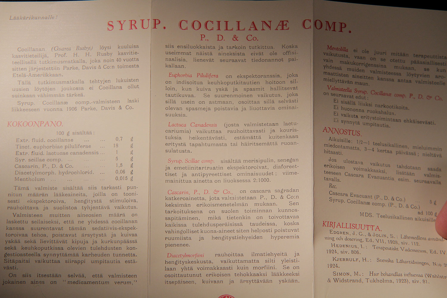 1920-luvulla myytiin Syrup. Cocillanae Comp. yskänlääkettä, jonka yksi keskeinen ainesosa oli heroiini eli diasetyylimorfiini. Mainoslehtisen mukaan valmiste “ei sisällä liikaa narkootikoita”. Heroiini “on osoittautunut erikoisen tehokkaaksi lääkkeeksi itsepäiseen, kuivaan ja ärsyttävään yskään.”