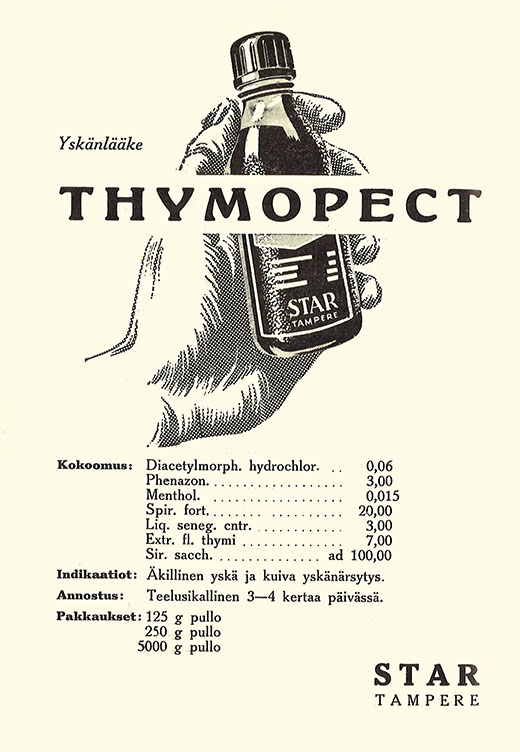 Heroiinia käytettiin paljon vaikuttavana aineena juuri mikstuuramaisissa yskänlääkkeissä, kuten tamperelaisen Star-lääketehtaan valmistamassa Thymopectissa 1940-luvulla.